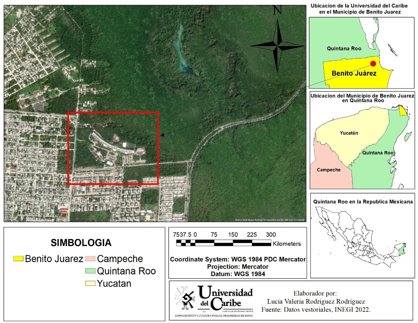 El Santuario Urbano de Murciélagos de la Universidad del Caribe, se encuentra ubicada al norte de la ciudad de Cancún, en las inmediaciones de la Universidad del Caribe, en el Lote 01, Manzana 01, SM 78, entre las avenidas Bonampak y calle 88, en el Municipio de Benito Juárez, Quintana Roo (México). La cueva se encuentra inmersa en un remanente de vegetación de 2.61 hectáreas. La Universidad se encuentra dentro de la Unidad de Gestión Ambiental (UGAs) 21 “ZONA URBANA DE CANCÚN” y 22-B “ANP CHACMOCHUCH Y MANATÍ”. De igual manera, se encuentra bajo un Programa de Ordenamiento Ecológico Local (POEL) del municipio de Benito Juárez y el Programa de Desarrollo Urbano (PDU) de la ciudad de Cancún vigente actualmente.