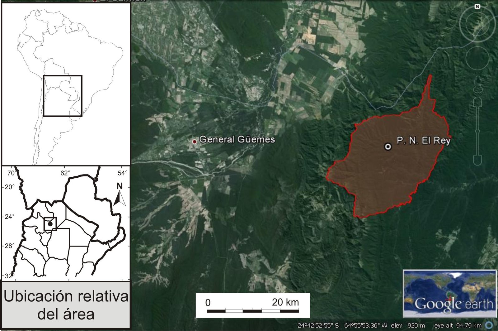 El PN El Rey posee una superficie de 44.162 ha abarcando un rango altitudinal de entre 750 y 2300 m sobre las Sierras Subandinas. Posee un clima subtropical, con temperaturas medias que oscilan entre los 22 y 25 °C y precipitaciones estivales que superan los 1000 mm. El relieve es accidentado y con pendientes fuertes en sus límites occidentales. Está delimitado hacia el oeste, norte y este por un arco serrano del cual nacen quebradas con arroyos permanentes que drenan hacia el sudeste y desaguan al río del Valle a través del río Popayán, que discurre aún en el interior del parque. El amplio rango de altitud que ocupa da lugar a diferentes ambientes pertenecientes a la región de Yungas y Chaco Serrano. Las zonas bajas presentan elementos chaqueños parcialmente degradados, con espinales de corona de cristo (Gleditsia amorphoides) y bosquecillos secundarios de tusca (Acacia aroma), coronillo (Scutia buxifolia), chal-chal (Allophylus edulis), cochucho (Zanthoxylum coco), piquillín (Condalia microphylla), tala (Celtis ehrenbergiana), y cardones (Cereus sp.) entre otras. Algunas de estas especies son típicas de zonas degradadas, lo que denota el intenso uso ganadero que antiguamente sufrió esta zona. Las partes intermedias presentan los pisos típicos de las Yungas: Selva Montana, con los estratos de laurel (Cinnamomum porhyrium) y tipa (Tipuana tipu) en las zonas basales; Bosque de mirtáceas, a partir de los 800 metros donde predomina el palo barroso (Blepharocalix salicifolius), el alpamato (Myrtus mucronata), el mato (Myrcianthes mato) y el chal- chal (Allophylus edulis); Bosque montano, sobre los 1.500 metros con comunidades puras de pino del cerro (Podocarpus parlatorei), aliso (Alnus acuminata) y pequeños queñoales (Polylepis australis); y finalmente pastizales de altura en las zonas más elevadas. En los pisos intermedios basales llama la atención la gran variedad de epifitas como bromelias tanque (Tillandsia maxima), los claveles del aire (Tillandsia spp.), y varias especies de orquídeas. Esta amplia variedad de ambientes posibilita la presencia de un importante número de especies de animales. El área cuenta con 285 especies de aves registradas y además de las aves amenazadas se han registrado el águila solitaria (Buteogallus coronatus), el águila viuda (Spizaetus melanoleucus) y el halcón negro grande (Falco deiroleucus).